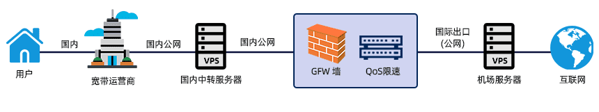 用户 -> ss、ssr等协议 -> 国内中转服务器 -> 公网或内网穿过GFW -> 国外服务器