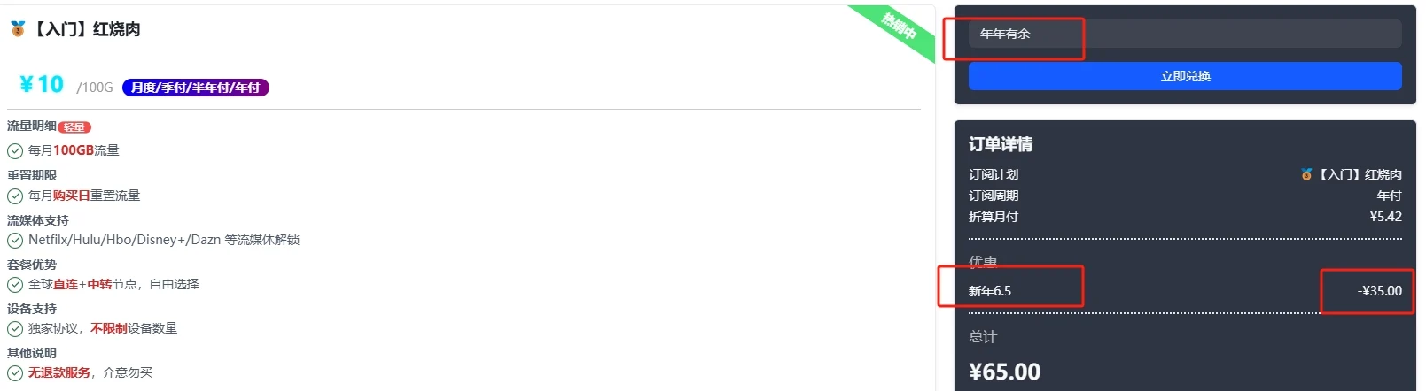 好好云🏮 新春特惠活动 🏮 发表评论 好好云🏮 新春特惠活动 🏮 龙年辞旧 蛇年迎新 ⏰ 1月26日 17:00 – 2月12日 23:59:59 🧧 优惠方案及折扣码 【月付】8折 | 码:新年快乐 【季付】7.5折 | 码:蛇年大吉 【半年】7折 | 码:万事顺意 【年付】6.5折 | 码:年年有余 【不限时】7.5折 | 码:恭喜发财 好好云🏮 新春特惠活动 🏮 注意事项: 每个优惠码仅限使用一次 优惠码不可叠加使用 请根据需求选择合适的套餐方案 Rate this post