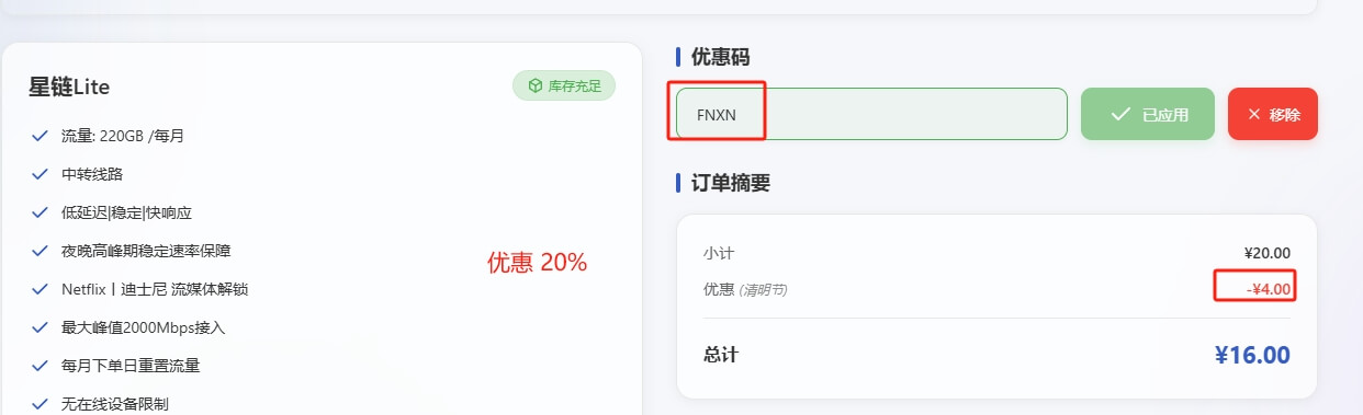 2025年的清明节,星链云推出了八折优惠码:FNXN,不管是月付、季付、半年、年付,都是这个力度。