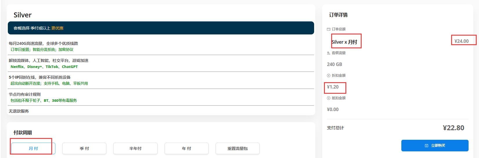 • Silver:¥24/月,240G流量/月。
