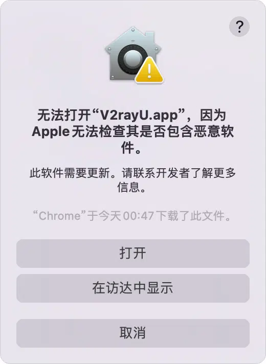 在新出来的授权弹框中输入登录账户密码,会再出现确认提示框,点击“打开”,V2rayU的图标出现在状态栏中,如下图所示。