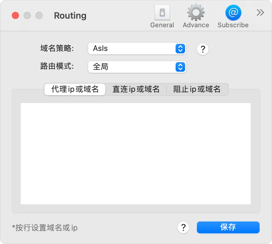 打开主菜单 -> 服务器设置,点击路由设置,在这里可以配置域名策略及路由模式,已经需要代理IP或域名、需要直连IP或域名、需要阻止IP或域名,如下图所示新用户直接默认即可。