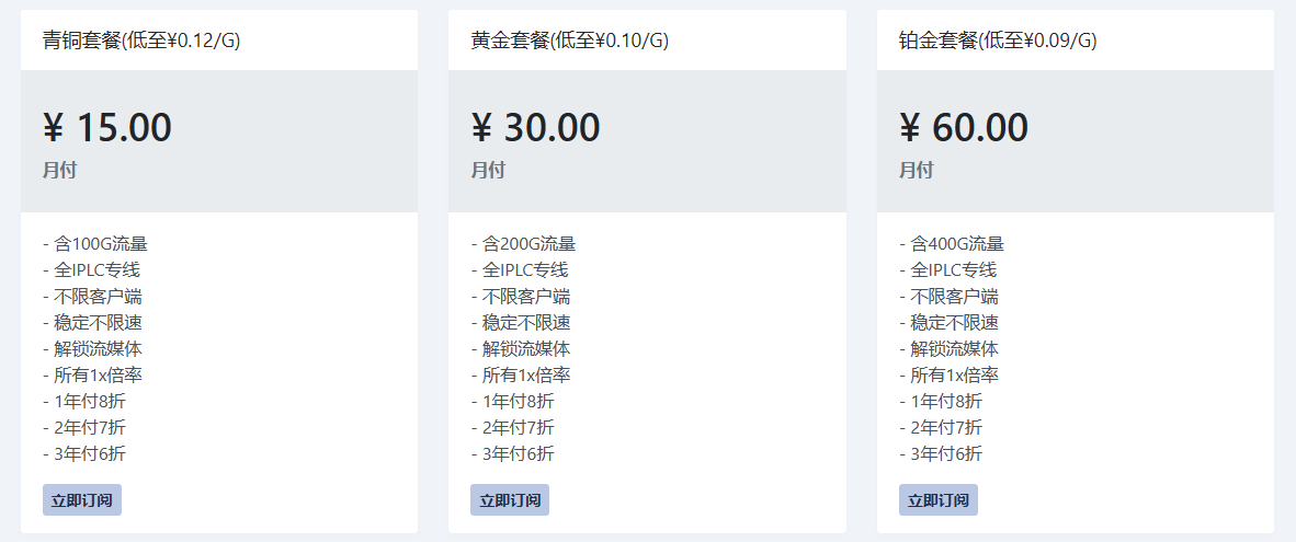 青铜套餐(低至¥0.12/G) ¥ 15.00 月付